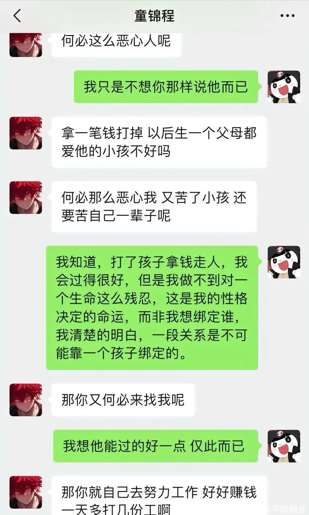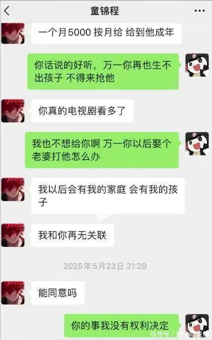 后来女方担心童锦程结婚生子后就懒得管孩子,所以提出每个月一万的抚养费,还额外要cover自己生孩子住院的开销,还要求一次性支付18年的抚养费,总共220万。