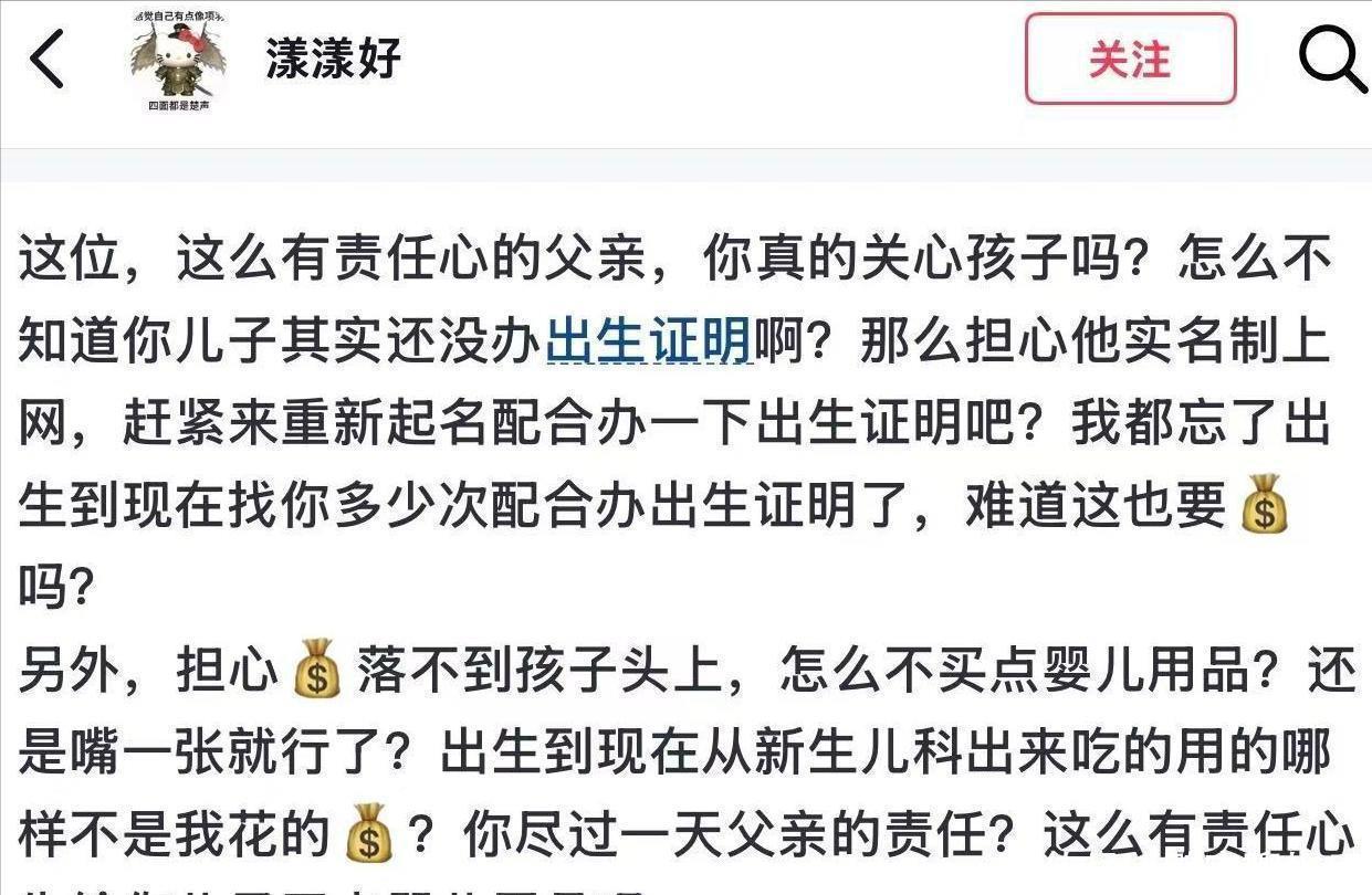 她发了一条回击的说说,暗指童锦程其实并不是真心在乎孩子,还爆料说因为童锦程屡次不合作,这才导致孩子现在还没有办出生证。
